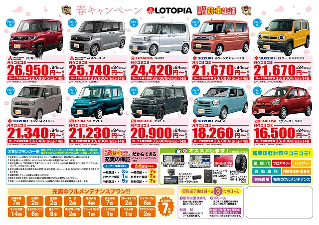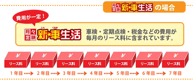 ロートピアの【新☆車生活】は7年間月々定額で新車と維持費の基本的な部分が全てコミコミとなっています。